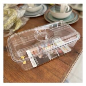 Bandeja acrilico rectangular 30x20x16cm transparente con tapa ovalada y asas pequenas