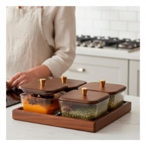 Set de 4 Recipientes Marron con Tapa Madera y Base Cuadrada para Cocina y Hogar