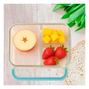 Taper de Vidrio con 3 Divisiones para Llevar Ensaladas y Frutas Tapa Celeste
