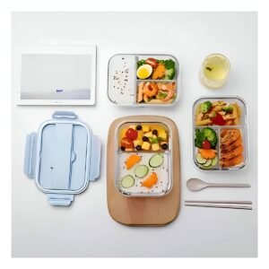 Pack2 Contenedor de Vidrio con 3 Divisiones para Preparaciones Diarias Tapa Celeste