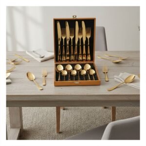 Pack2 Kit Mesa 16 Cubiertos con Estuche Organizador Dorado