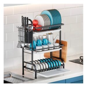 Escurridor de Platos de 3 Niveles con Soporte para Utensilios y Tabla Negro