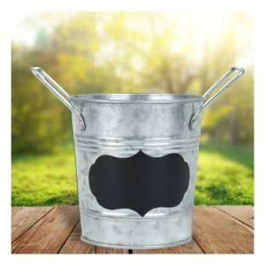 Maceta Cubo de Metal con Doble Agarradera y Cuadro para Nota en Plateado