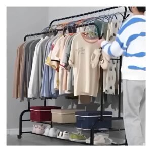 Estante Colgador Doble con 2 Niveles Inferiores y Ruedas Negro para Organizar Hogar