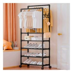 • Estante Multifuncional Negro con 5 Niveles y Doble Perchero Movil